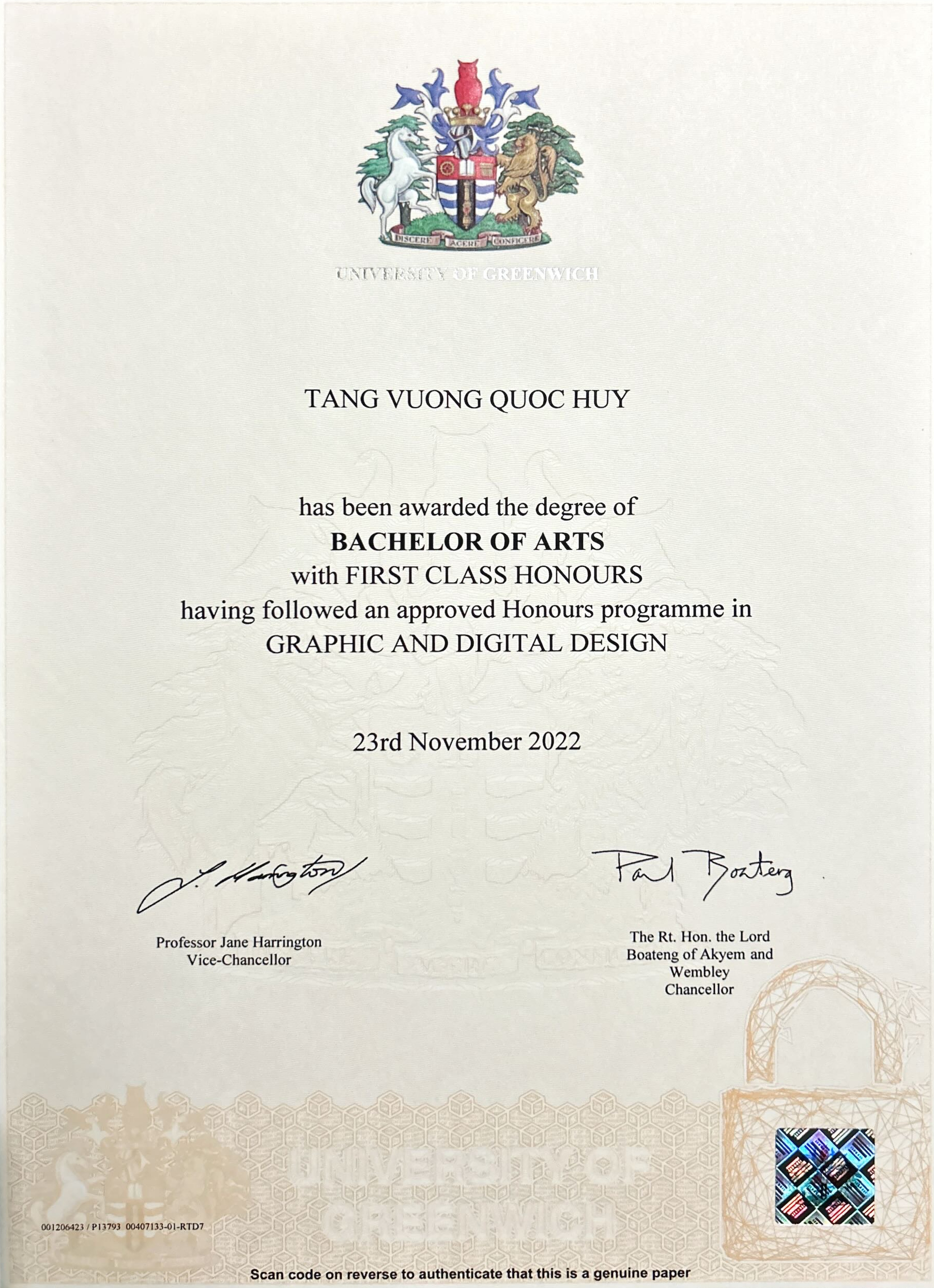 Graduated with First Class Honours.